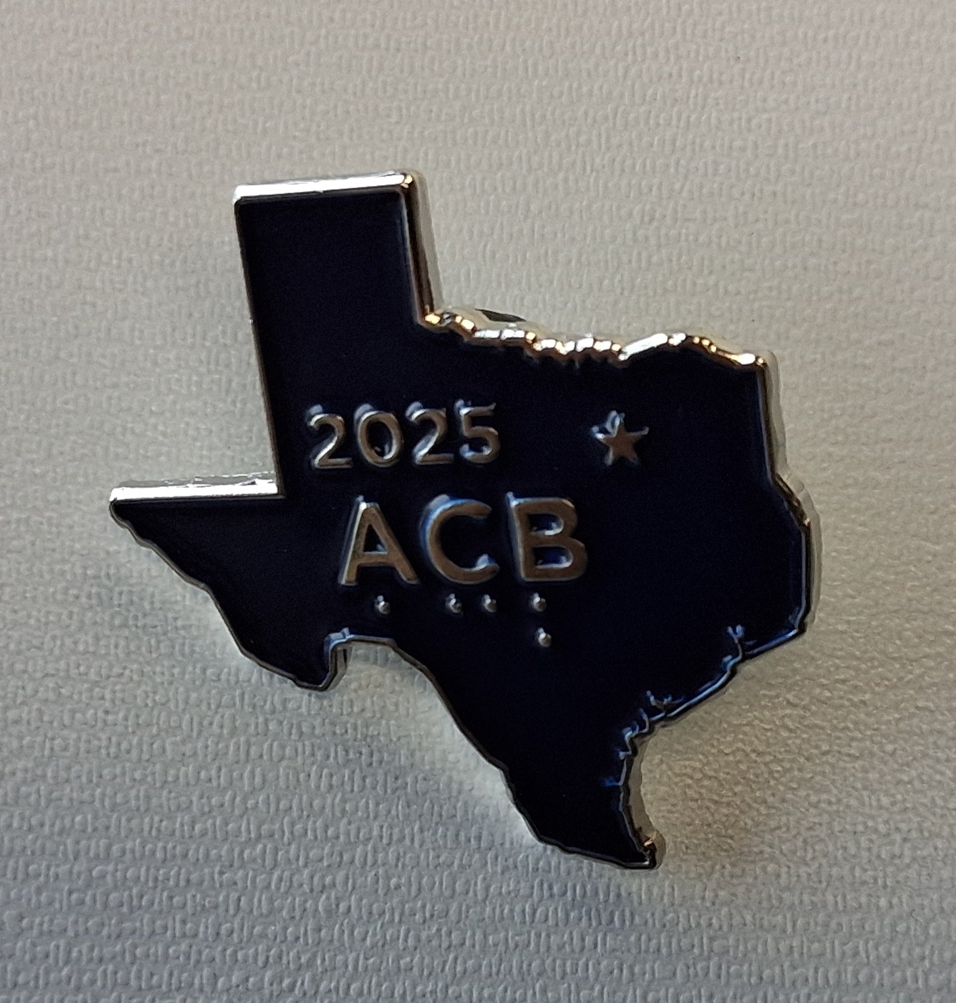 The 2025 ACB Convention Pin is in the shape of the state of Texas. It's navy blue with the year, ACB logo and the star in the location of Dallas in silver.